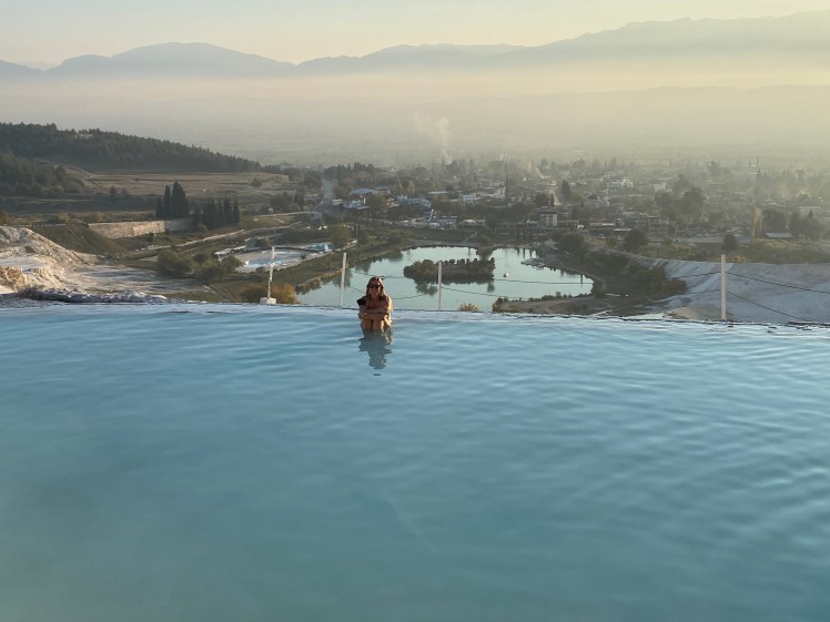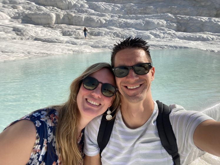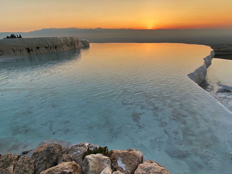 Na Izmir bezoeken we nog Pamukkale, hier zijn de ruines van Hierapolis, om hier te komen loop je eerst door een prachtig natuurverschijnsel. Over een aantal spierwitte terrassen stroomt natuurlijk verwarmd water met veel kalk wat prachtige plaatjes oplevert. Het Romeinse theater van Hierapolis is het hoogtepunt van de site. Voorlopig hebben we nu wel even genoeg oude stenen gezien.