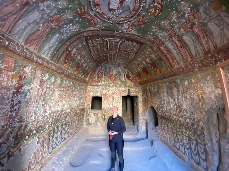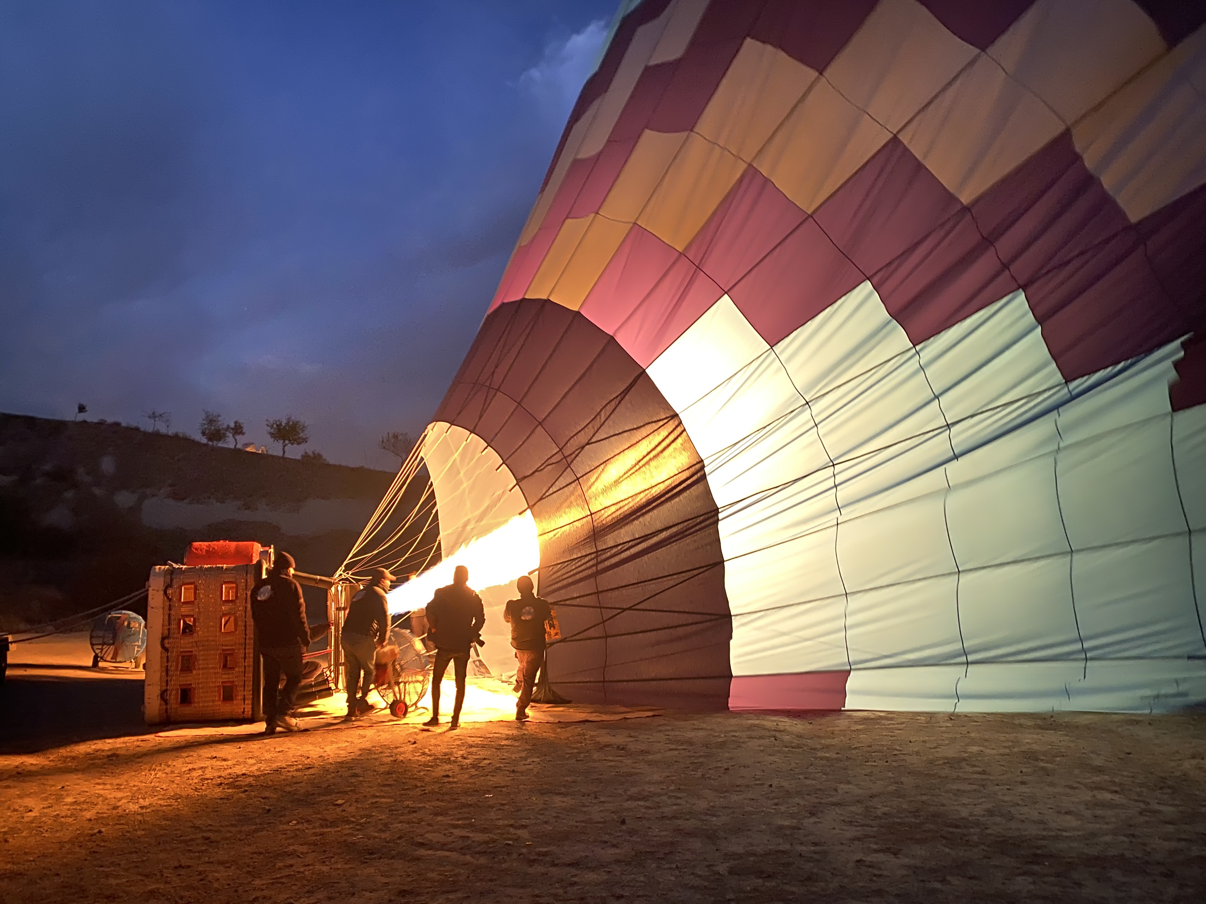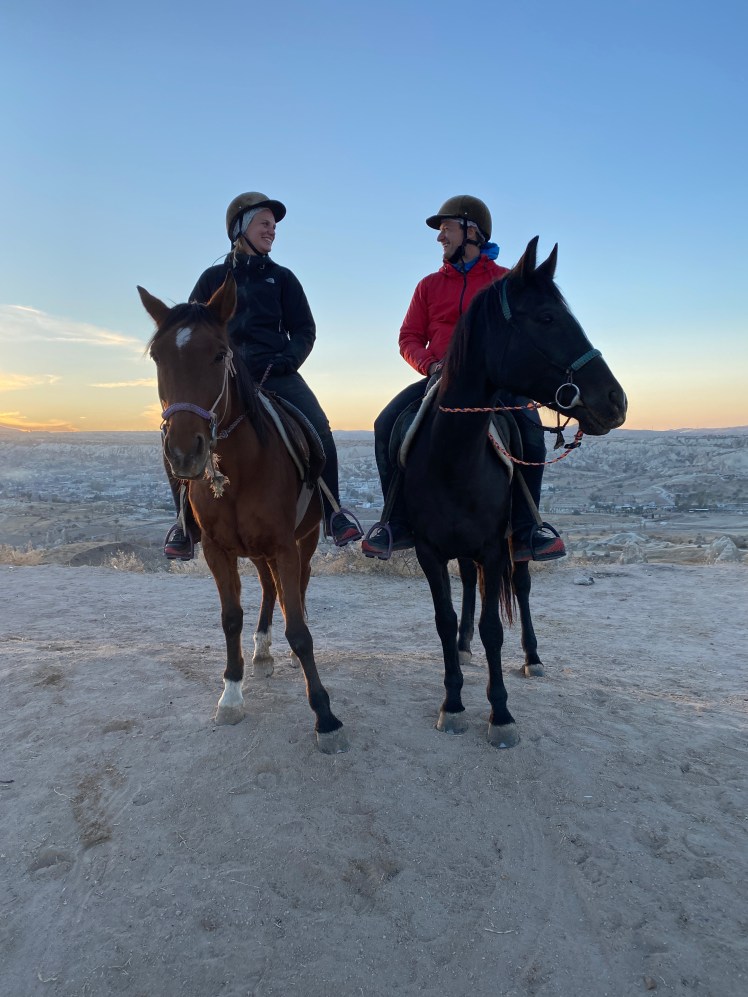 Op onze 1e ochtend starten we al met de topattractie van de regio: met een hete luchtballon over de regio varen. Je ziet op o.a. Instagram talloze plaatjes voorbij komen van luchtballonen in Cappadocië, de ene nog mooier dan de andere. We zijn erg benieuwd hoe het er in het echt uitziet. Dik aangekleed (het wordt hier ‘s nachts -7) worden we voor zonsopgang opgehaald. Eenmaal de lucht in zien we dat de plaatjes op instagram niks hebben gelogen, zonder filters of bewerkingen ziet het er daadwerkelijk sprookjesachtig uit om vanuit de lucht tientallen luchtballonnen te zien boven het bizarre landschap. Als je ooit in de buurt bent, mag je dit echt niet overslaan!