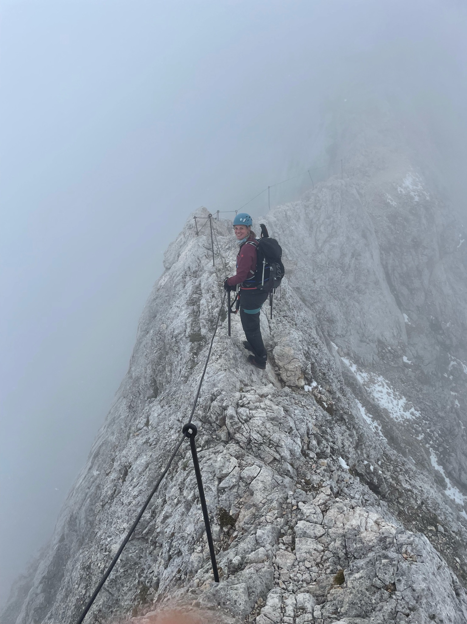 De tweede dag gaan we via de Dom Planika hut naar de top van de Triglav. Het weer is tijdens de toppoging niet al te best, de laatste 3 uur klauteren we met behulp van onze klettersteigset in de regen en sneeuw naar de top. Uiteindelijk hebben we boven op de top een zeer voldaan gevoel, maar een gevaarlijke afdaling wacht nog op ons terug naar de Dom Planika hut. Een kleine oplettenheid zorgt nog voor een val van Erwin, maar de schade is gelukkig niet groter dan een kapotte hardshell broek.