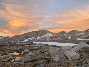 Forester pass is de eerste pas die we over moeten en is gelijk het hoogste officiële punt van de PCT, 4009 meter! We hebben het geluk dat we vlak onder de pas kunnen kamperen, wat een bijzondere plek om te staan! Normaal ligt er rond deze tijd veel sneeuw op de pas nog, maar het is een bijzonder laag sneeuw jaar in de Sierra’s, dat merken we overal en dus ook hier. Wij gaan zonder sneeuw omhoog en hebben maar een paar kleine stukjes sneeuw naar beneden.