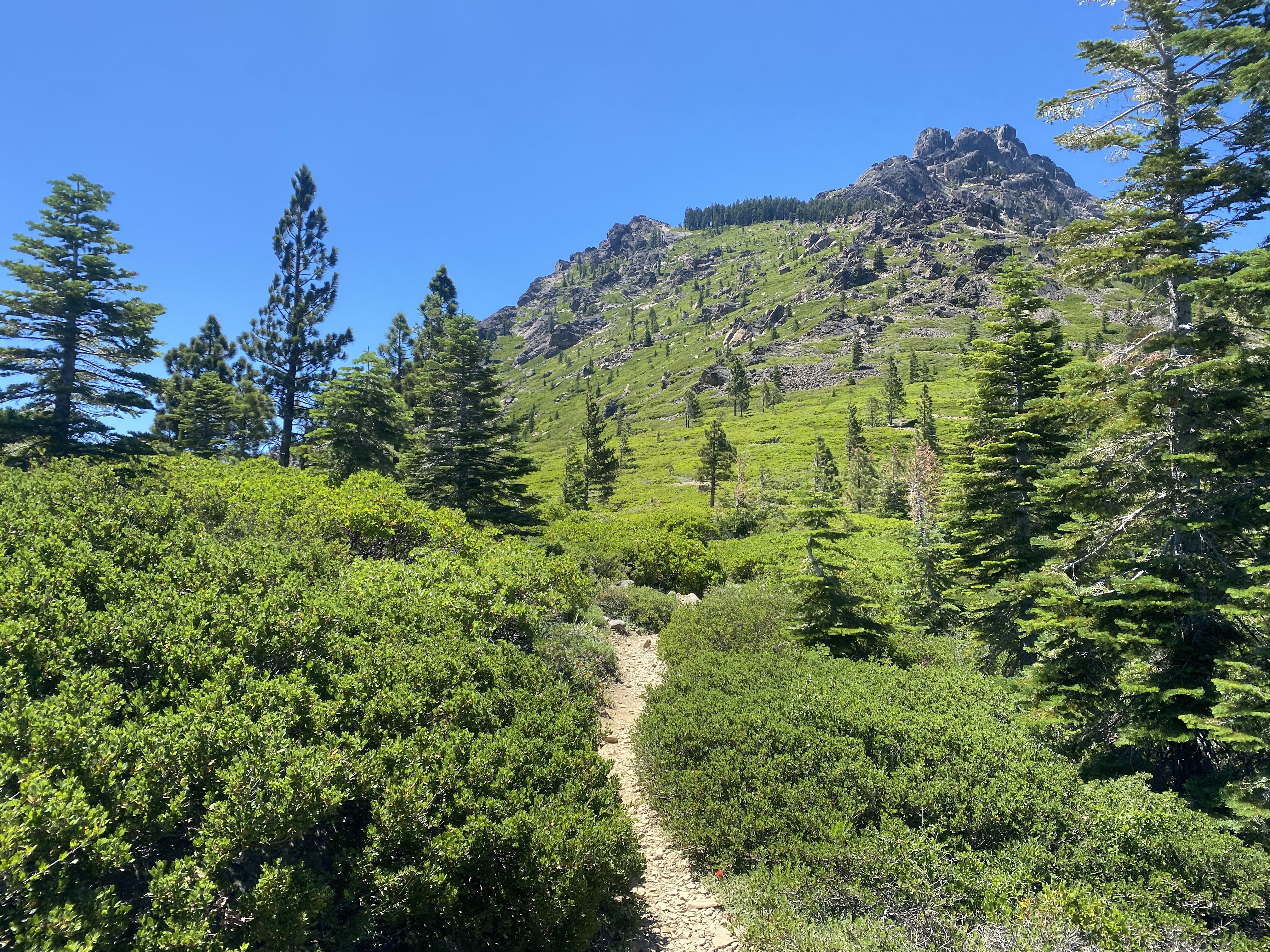 Het is een klein stukje terug naar de trail en er is nog niet veel verkeer dus we lopen dit terug. Zoals gewoonlijk beginnen we met een enorme klim terug de wildernis en de bergen in. We merken dat het nu echt hoogzomer wordt in Noord Californië, de slaapzakken blijven open in de nacht en de donsjasjes blijven in de tas.