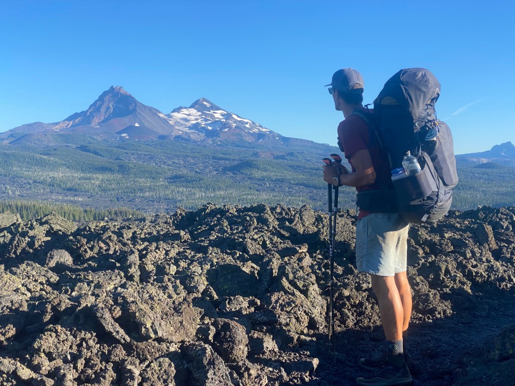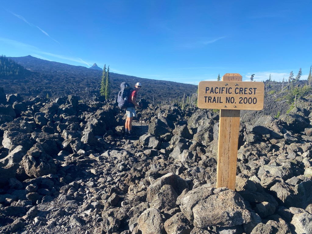 Nadat we zo’n geluk hebben gehad met onze lift uit Sisters is het tijd voor de volgende sectie. We starten waar we gebleven waren, middenin de lava velden. Het is een prachtig gezicht en met op de achtergrond soms the Sisters, Three Fingered Jack en zelfs Mt. Jeffersons af en toe nog spectaculairder. Maar het is wel erg zwaar lopen, dus houden we het deze avond al na 8km voor gezien. Precies aan het einde van de lavavelden vinden we een mooi plekje vanwaaruit het nog precies 10km lopen is naar Big Lake Youth camp. Daar gaan we morgenochtend ontbijten!