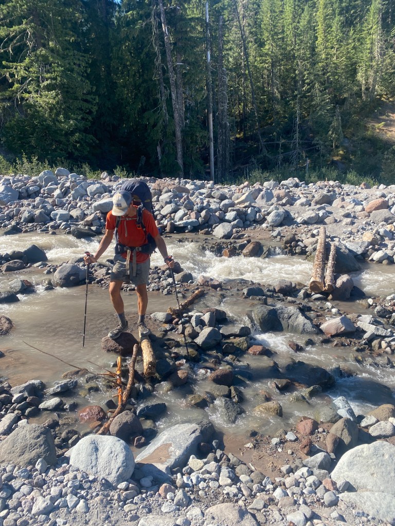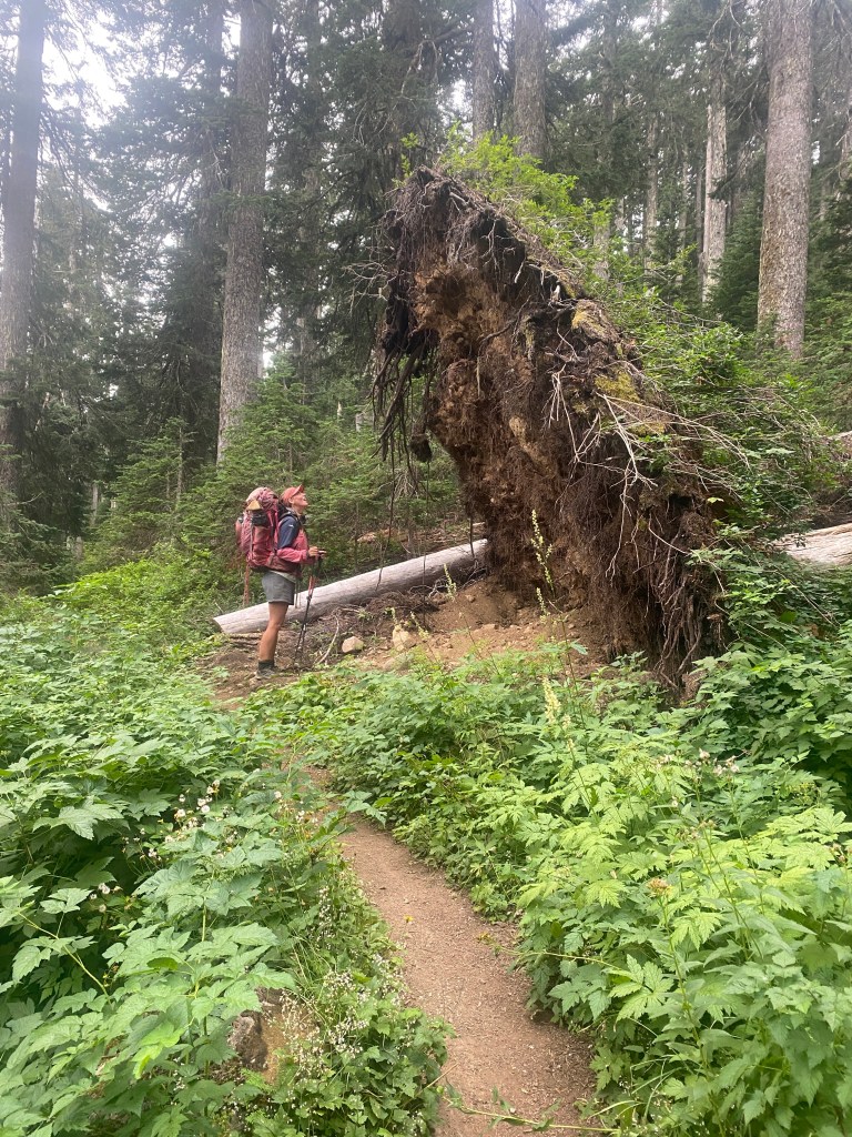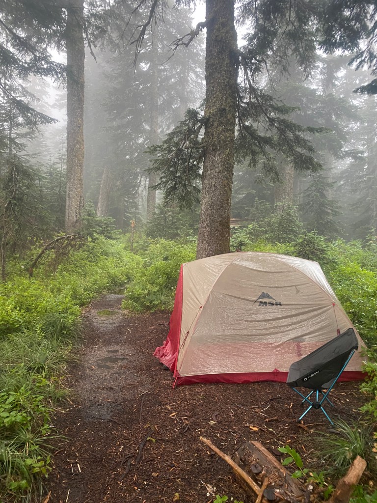 De twee dagen daarna laten we mt. Hood langzaam achter ons en dalen we af door de bossen naar Cascade Locks, het laagste punt op de trail, bijna op zeeniveau. De trail is niet overal goed onderhouden en het lijkt af en toe meer een obstacle run. De één na laatste avond komen we in een wolk terecht en moeten we de tent snel bijna op de trail zetten om niet drijfnat te worden.