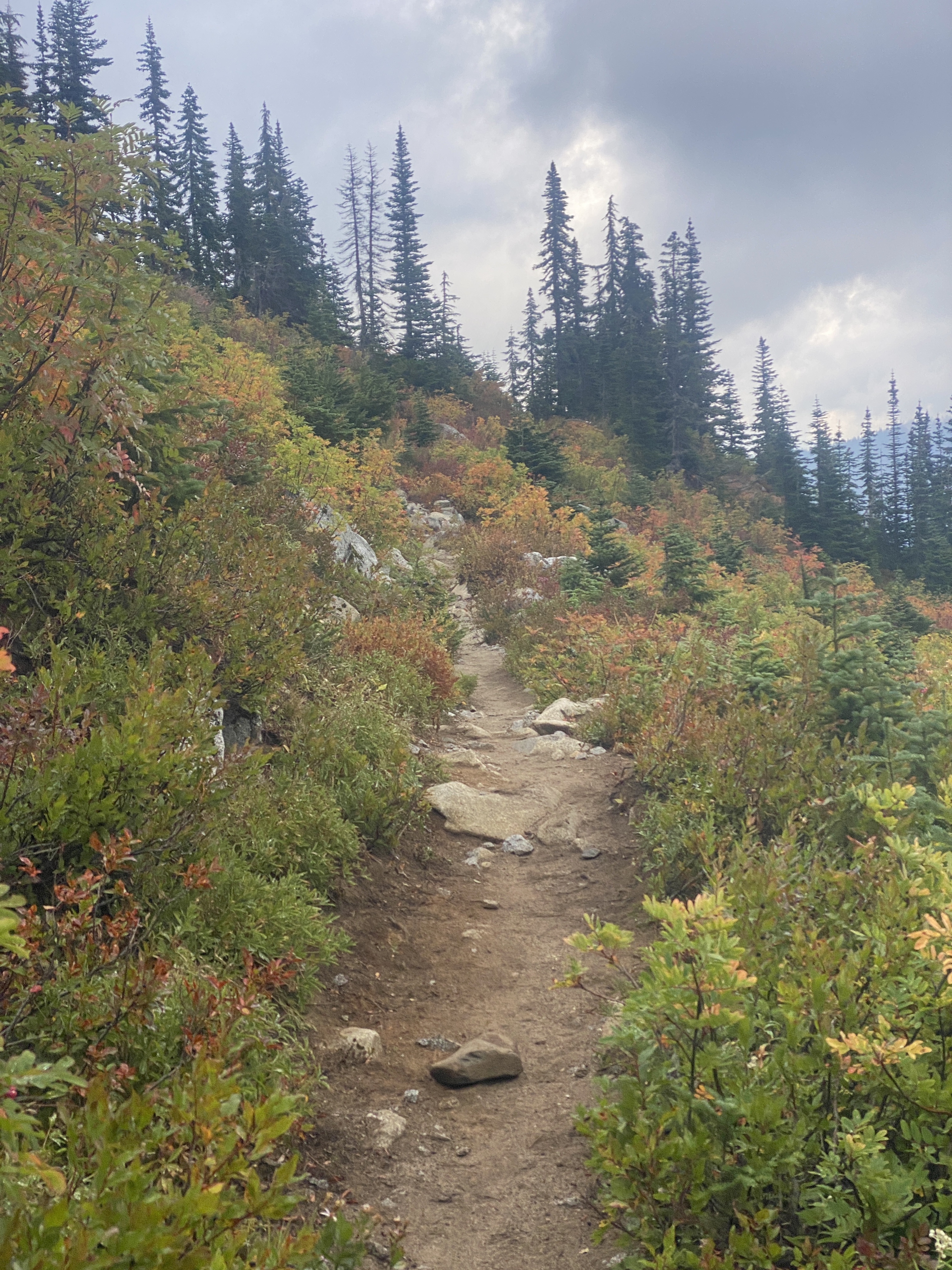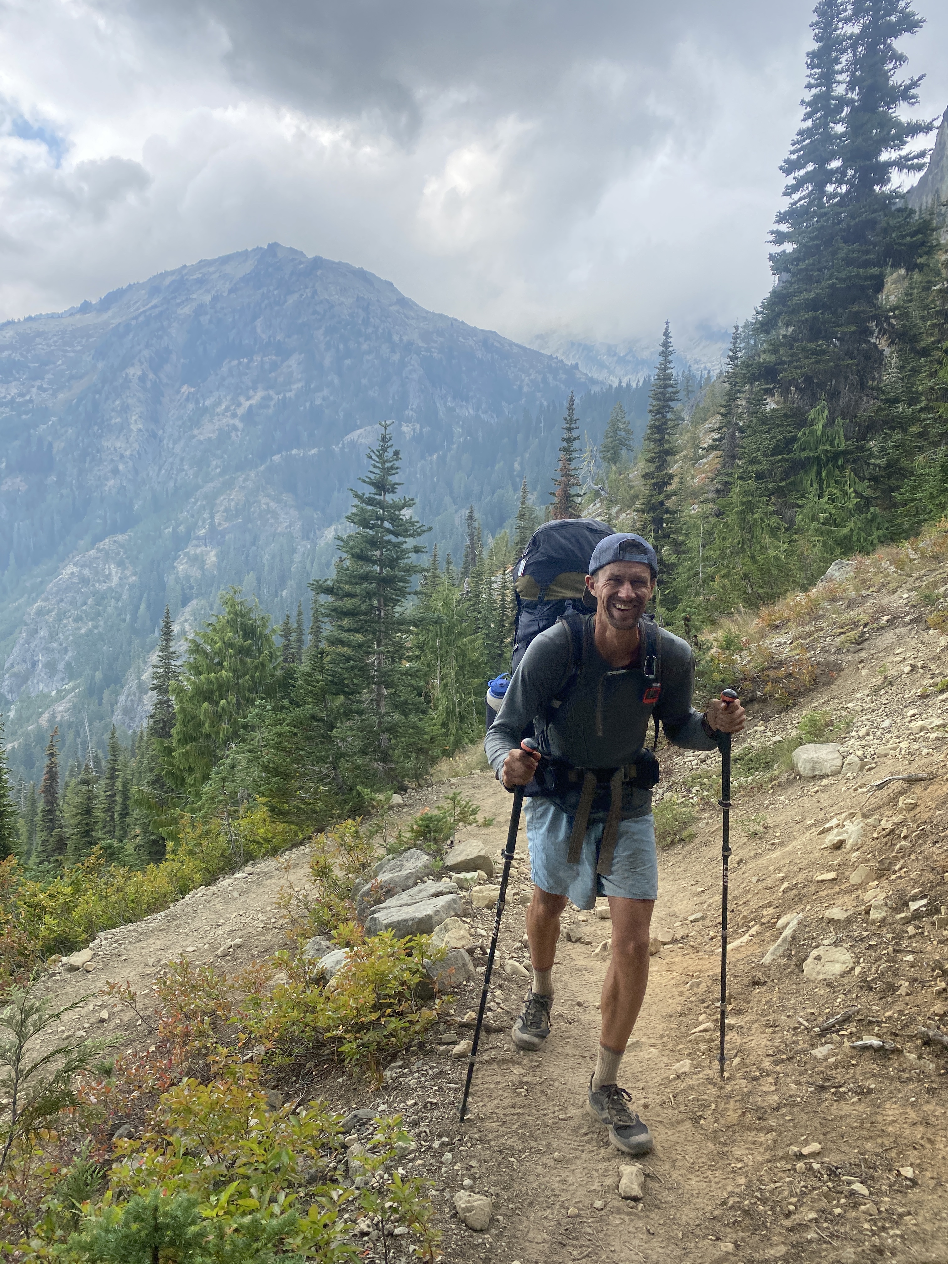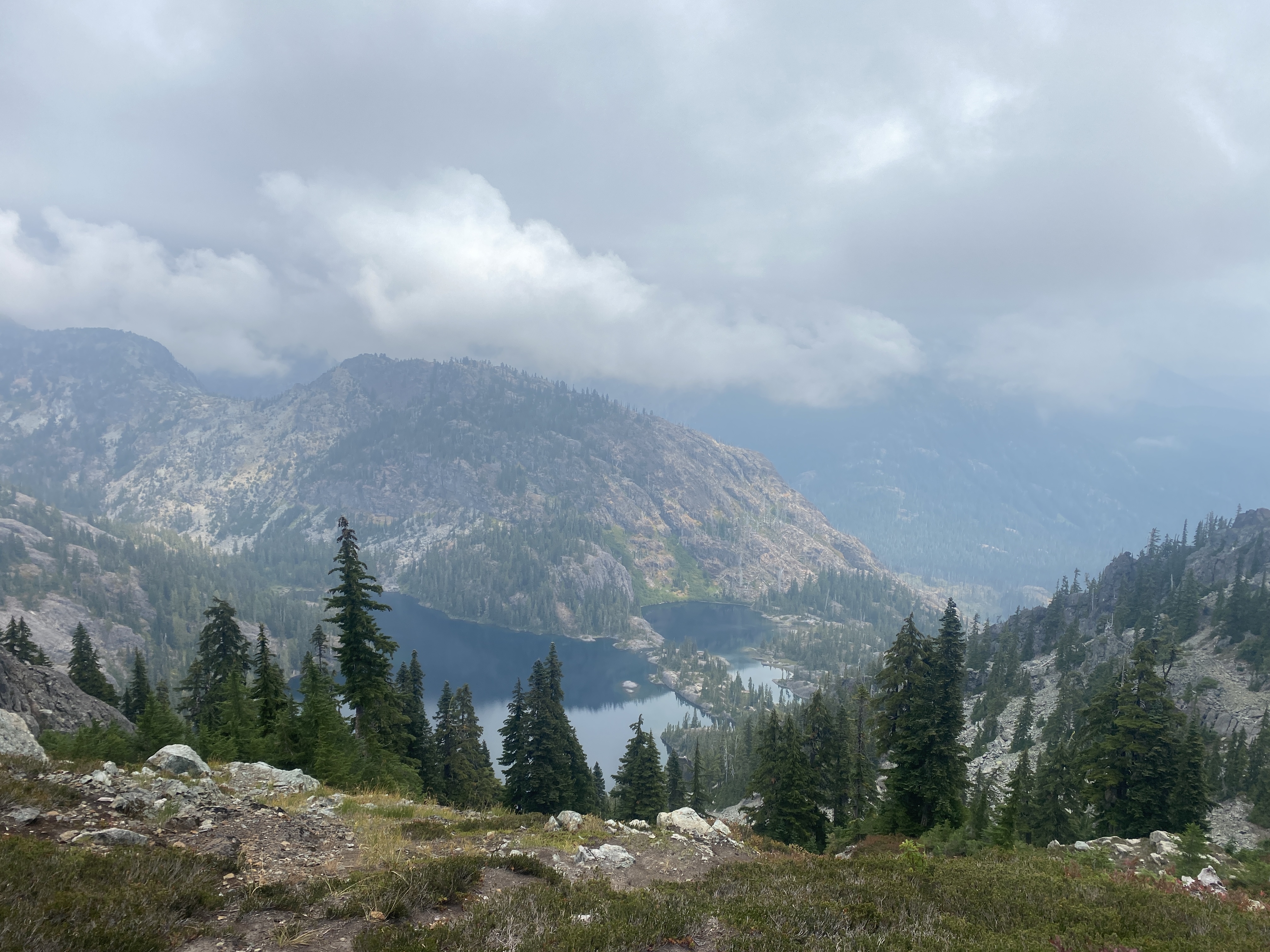 Maar de situatie rondom de rook lijkt vooralsnog goed te doen. Dat komt mede door het weer. De wind is gaan liggen en de mist en regen is opgekomen. Dat betekent dat we de eerste 1,5 dag niks zien van de uitzichten onderweg. Wat wel jammer is, want deze sectie wordt beschreven als één van de mooiste van de PCT. Maar gelukkig trekt het op een gegeven moment open en zien we de mooie uitzichten verschijnen. Het blijft wat onguur weer, de herfst is echt begonnen in Washington, maar we krijgen wel mooie views terug voor de lange klimmen die we maken. We zien de prachtige vergezichten die Noord Washington zo mooi maken, Chimney Rock West, Mt. Daniels en de gebergtes en meren hieromheen. Omdat het even onzeker was of we hier nog wel zouden lopen voelt elk uitzicht als een cadeautje en zijn we enorm dankbaar dat we dit deel van Washington nog mogen zien.