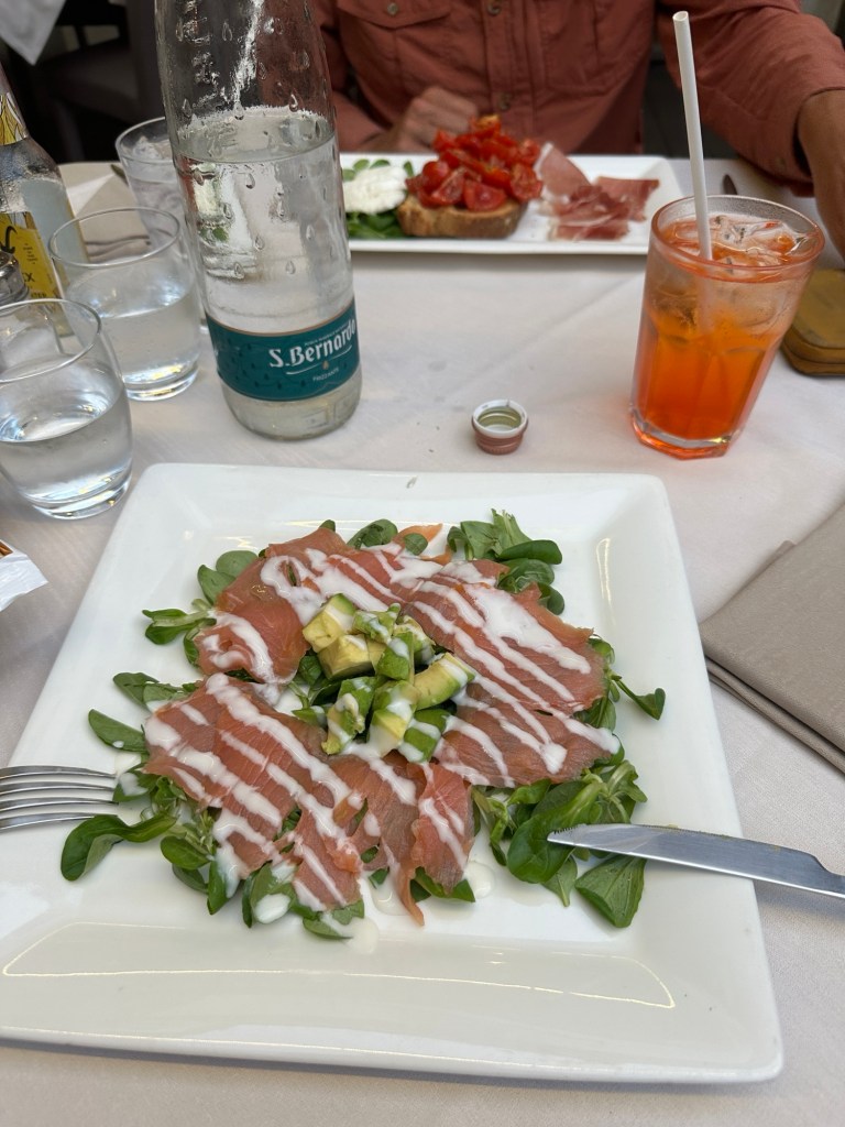 En dat eten in Italië is ook een beleving. Zelfs wij, terwijl we continu kunnen eten, hebben moeite om alles op te eten wat ze in Italië voor je neus schuiven. 4 gangen met pasta, vlees, aardappels en toetjes. Eén groot feest! Ze zijn ook best wel streng, we krijgen bij het avondeten geen cola. Dus gaan we braaf aan de wijn 😜.