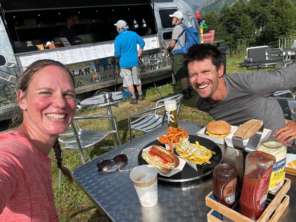 We eindigen met een korte dag (qua km) bij Maloja pas. Met onverwachts een berg sneeuw. We zijn wel lekker vroeg, kunnen wat drankjes scoren, F1 kijken en als verassing lekker een hamburger eten bij een foodtruck. Wij zijn helemaal happy!