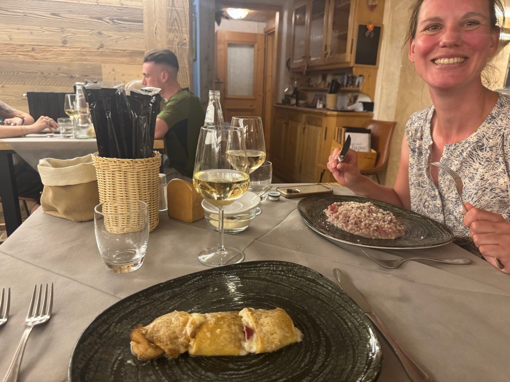 Het is ook de week van de lange dagen en hoge aantal hoogtemeters. We lopen deze week de Stelviopas op. En het is én goed voor de planning én gewoon ook erg leuk om daar ook te kunnen slapen. Dat betekent wel een dag van bijna 3000 hoogtemeters. Maar we halen het en zijn zelfs op tijd voor het eten! Wat in Italië iets makkelijker is aangezien ze hier pas vanaf half 8 eten.
