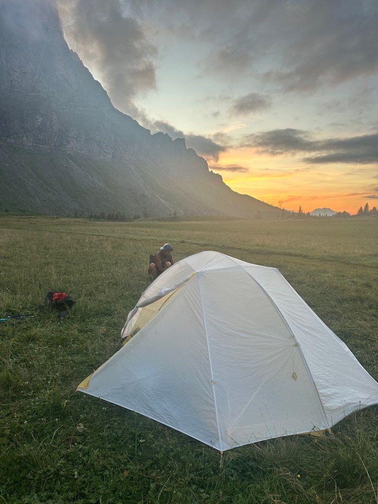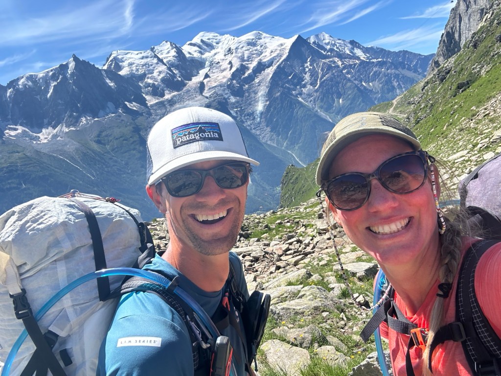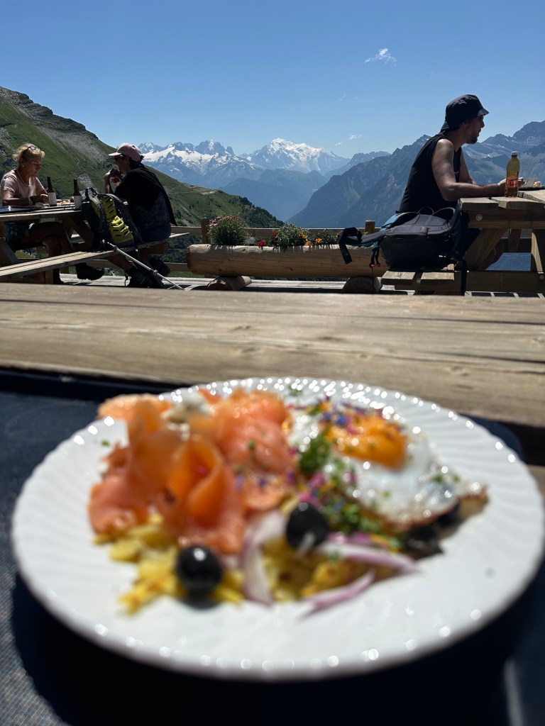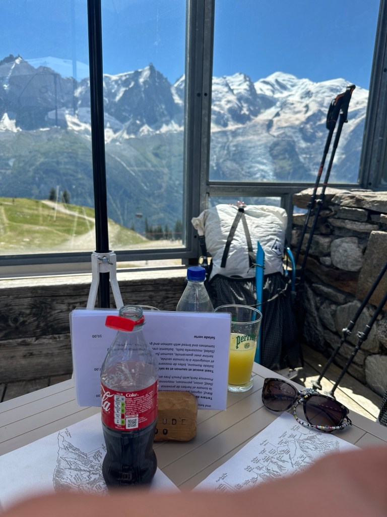We lopen deze week ook Frankrijk in. Wat meer kampeeropties geeft. We mogen hier namelijk op veel plekken bivakkeren tussen 1900 en 0900. We maken er gelijk gebruik van en bij Refuge Alfred Willis zetten we dan ook onze tent op. Dan op tijd de wekker en op naar Chamonix! We krijgen nog een pittig laatste klimmetje voor onze kiezen maar lopen dan met een waanzinnig uitzicht op de Mont Blanc via de Brevent Pass het Chamonix dal in. We besluiten iets lager op 2000m nog even te lunchen voor we de laatste 1000meter naar beneden gaan lopen richting het stadje. Daar kunnen we direct inchecken en na een snelle douche scoren we in no time allebei badkleding en een ijsje (het is snikheet inmiddels). Dan is het tijd om te genieten van de spa (onze spieren vinden de sauna heerlijk) en van een heerlijk uitgebreid diner (met bijpassende cocktails). Die cocktails pakken trouwens super leuk uit. De barvrouw komt bij elke cocktail enthousiast vertellen wat het is en hoe we hem vonden. Super leuk!