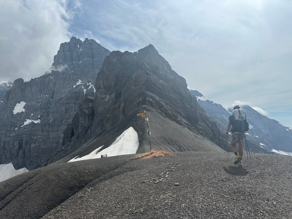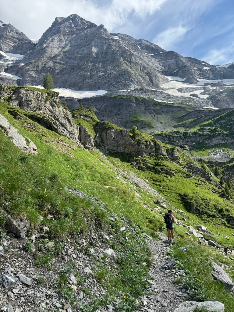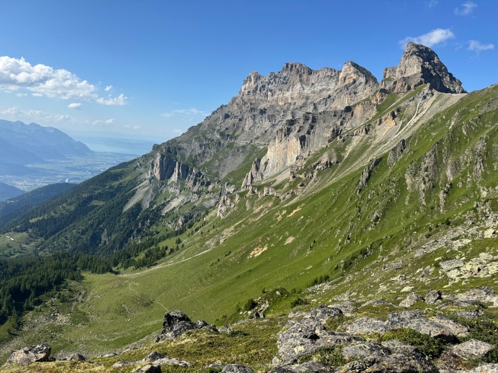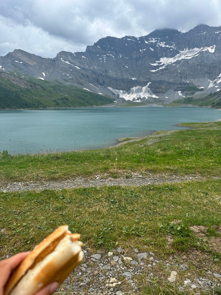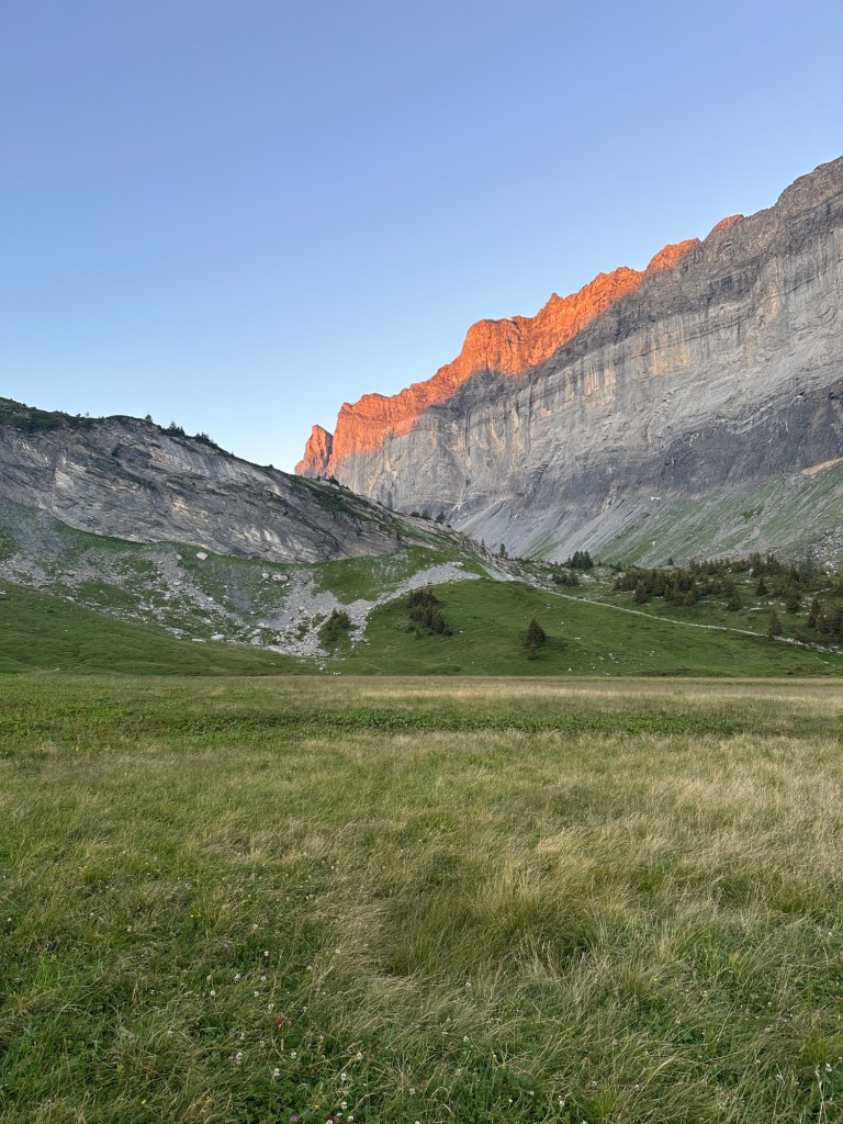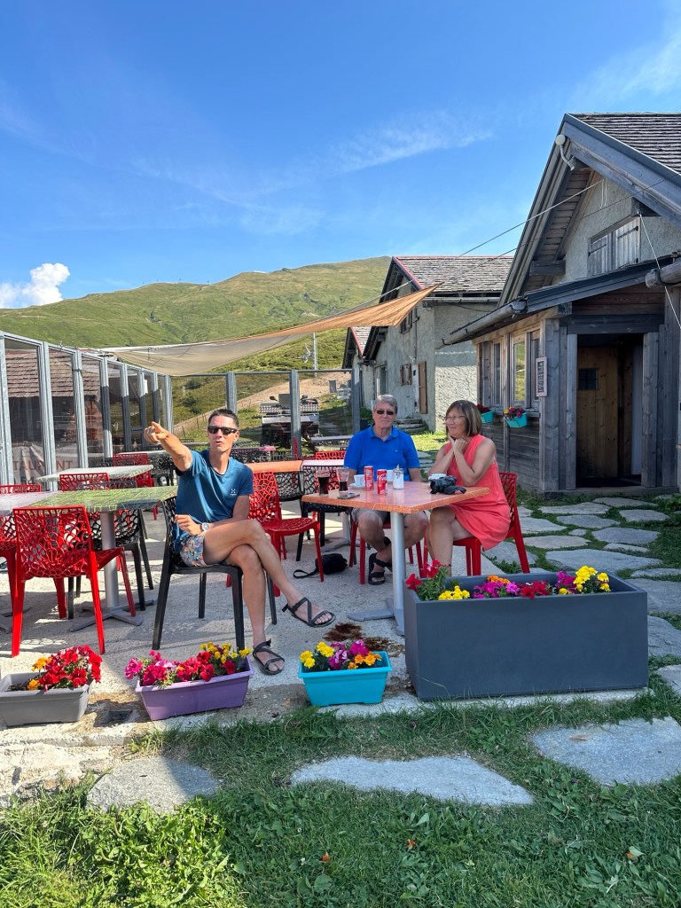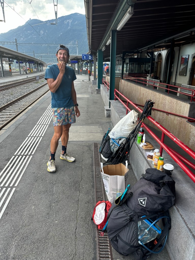 Maar daarvoor moeten we wel wat lange dagen maken. We eindigden vorige week in een hut en daar willen we extra vroeg weg. We gaan een lange dag van 40km tegemoet en we willen op tijd in Vernayaz zijn om nog de trein naar Martigny te kunnen pakken en daar nog te eten. De wekker gaat dan ook om half 6 en kwart voor 6 zitten we aan het (speciaal voor ons klaargezette) ontbijtje en dan tijd om de schoenen aan te trekken. Helaas, de schoenen staan achter een dichte deur en die gaat vermoedelijk pas rond 8 uur open. Hmm en nu? We lopen een paar rondjes om het gebouw om te zoeken naar een ingang en of ze ergens de sleutel hebben neergelegd. In eerste instantie zonder succes. We leggen ons er bijna bij neer dat we toch later weg moeten en dat ons plannetje om nog in Martigny te kunnen eten in duigen ligt. Gelukkig vindt Suus toch een deur waar ze naar binnen kan om stiekem via het personeelsgebouw ‘in te breken’ en de schoenen te pakken. Gelukkig maar, want ook met deze vroege start zitten we pas om half 11 in Martigny bij de mac, maar we hebben het wel gehaald! Het was wel een prachtige dag overigens!!