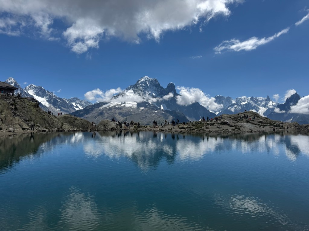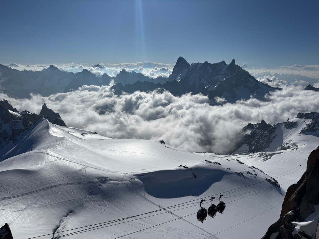 Bijna dagelijks zijn we ook in Chamonix te vinden. Het is maar een paar minuten rijden, en we raken er niet uitgekeken—of uitgewinkeld in de talloze outdoorzaken. In het hoogseizoen bruist het er van de gezelligheid, met concerten in het park en allerlei activiteiten. Suus is in deze periode jarig, en Erwin verrast haar met een tandemvlucht paragliden.