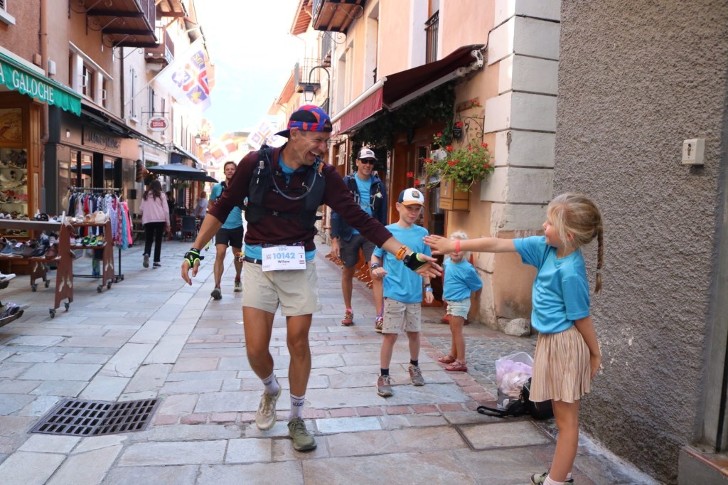 Terwijl Erwin de bergen trotseert, begint Suus ook aan een nacht vol avontuur. Na de start van de TDS overbrugt Suus twee uur in een sportcentrum en reist ze met de bus naar het eerste aidstation, waar ze een paar uur in een sportzaal slaapt. Zodra de zon doorbreekt, ziet ze Erwin weer – en ook Brian, Hélène en de kinderen komen even langs. Gezellig! We zien hem nog een paar keer die dag, voordat hij de nacht weer in gaat en de volgende ochtend vlakbij ons huisje voorbij komt, nog vol energie. Een goed teken voor de laatste etappe! Na 157 km halen we hem op bij de finish – wat een knaller van een race!