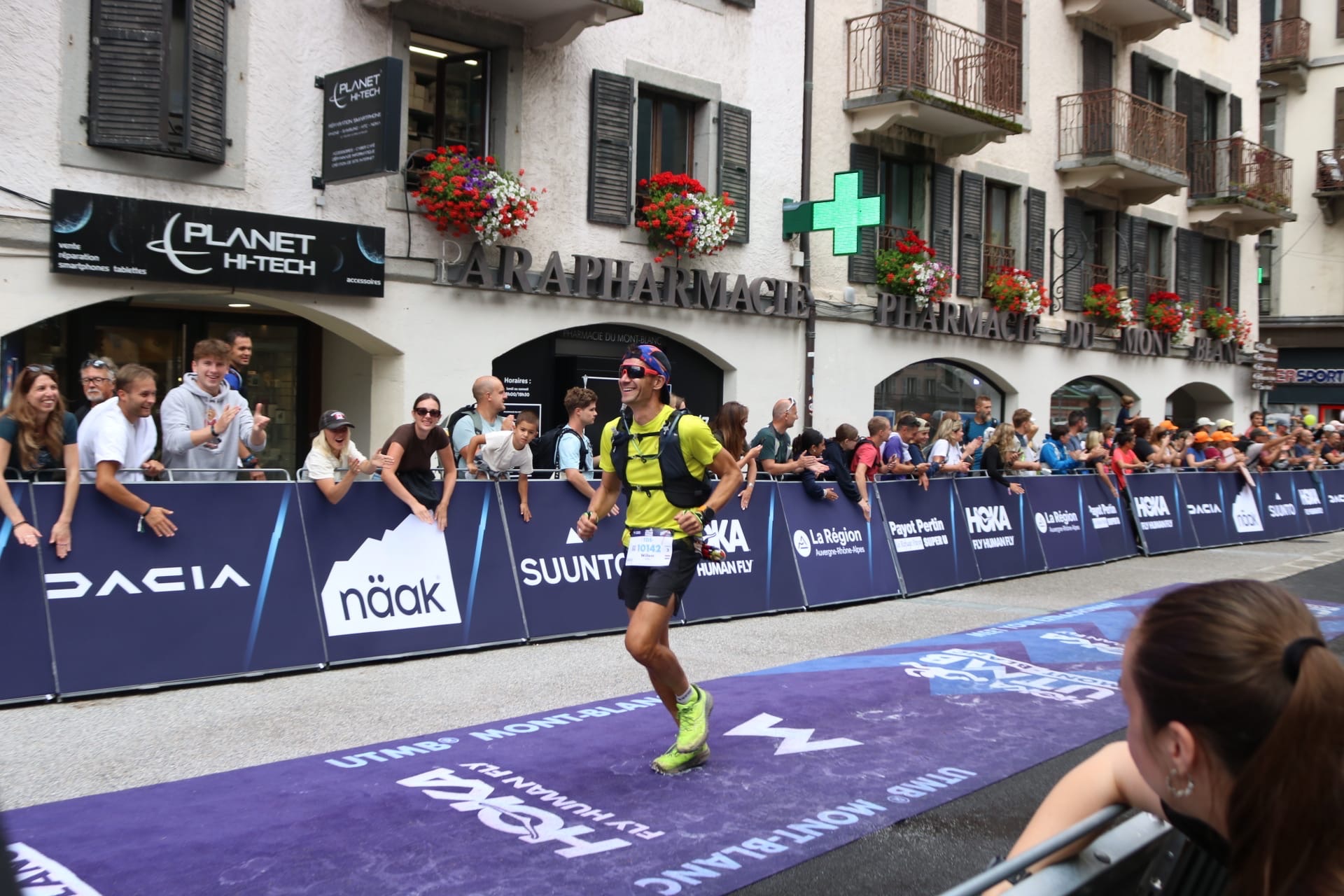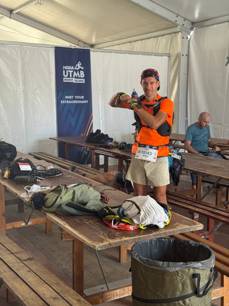 En dan is het zover: raceweek! Maandagochtend laden we de tassen in de auto en nemen we afscheid van ons appartementje in Les Houches. Echt een topplekje! Eerst rijden we naar Chamonix om Erwin’s startnummer op te halen. De trailvillage staat al vol kraampjes – een waar paradijs voor trail- en hardloopspullen. Suus scoort een nieuwe regenbroek (handig, want het belooft een race vol regen), maar verder weten we de verleidingen te weerstaan.